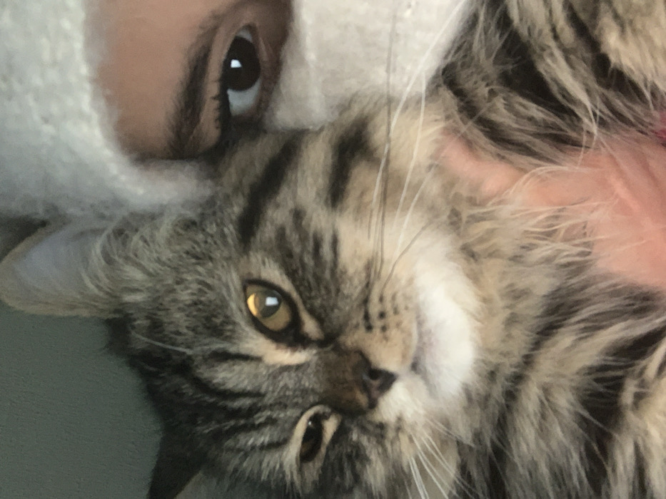 - "A tabby cat with golden eyes is held upside down, its head tilted" by FM-BF5Ai1, licensed under CC BY 4.0
