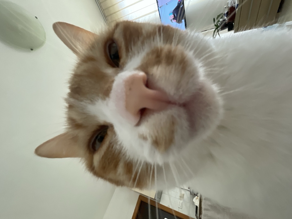 - "An extreme close-up photograph depicts the face of an orange and white domestic cat, filling the majority of the frame from a low-angle perspective" by FM-aSEY13, licensed under CC BY 4.0