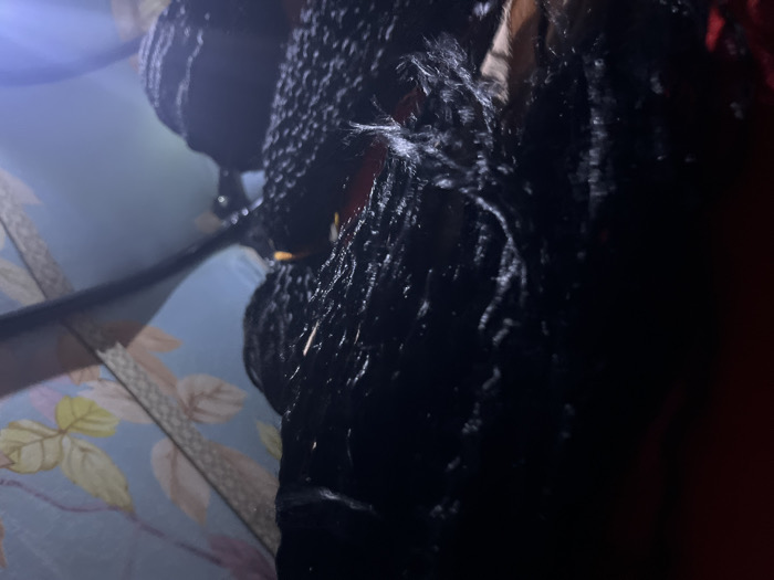 - "Braided black hair extensions cascade down the frame, contrasting with the light blue floral-patterned surface beneath" by FM-BhSYp2, licensed under CC BY 4.0