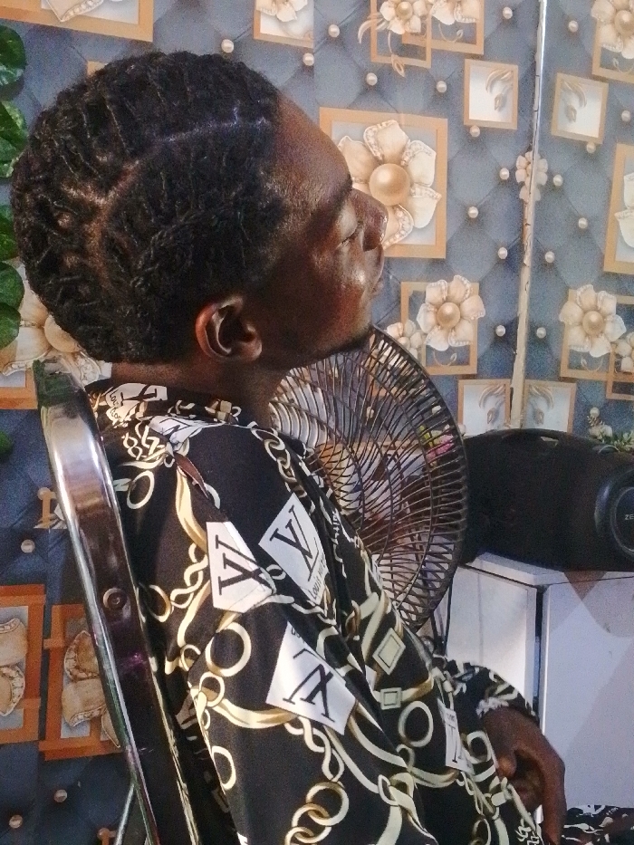 An individual is seated in a chrome-framed chair, viewed in profile, facing right, in a room located in Enugwu-Ukwu, Nigeria