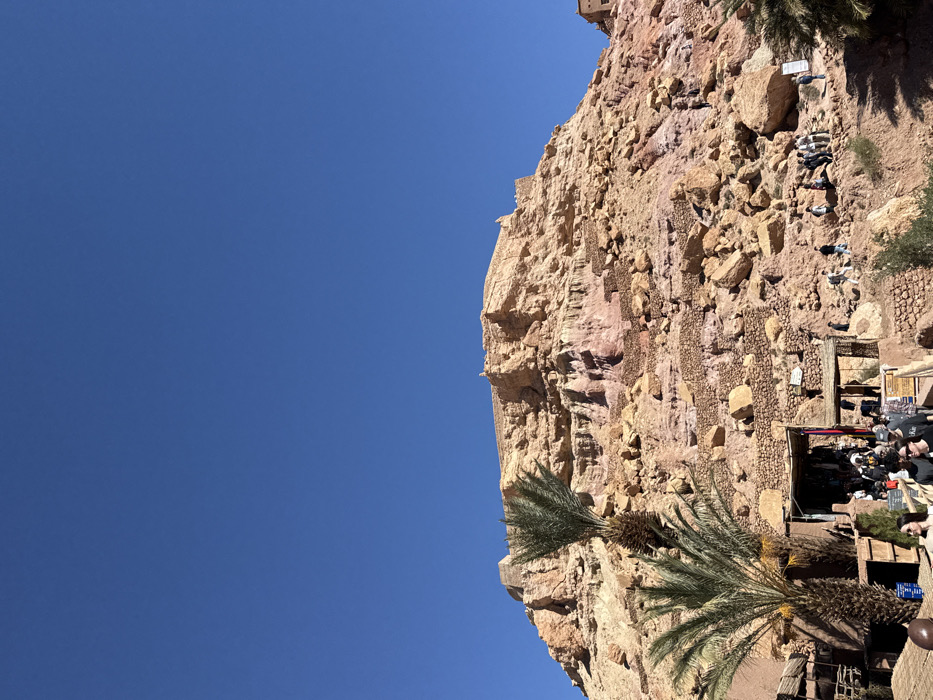 The image displays a rugged, sun-drenched mountain landscape in Tabouraht, Morocco, under a clear, deep blue sky. The prominent mountain, composed of light brown, beige, and reddish-pink rock strata, is extensively covered with loose boulders and smaller rocks. Along its summit and upper slopes, remnants of fortified structures, including mud-brick walls and towers, are visible. Tiered retaining walls, constructed from stone and mud, are integrated into the lower and mid-sections of the mountain's face. At the mountain's base, in the lower left, stands a cluster of earth-toned buildings. A large archway serves as a primary entrance, leading into a shaded commercial area with visible market stalls displaying various goods. Two mature date palm trees are prominently positioned near this entrance; one appears to be laden with dates. Approximately 25 individuals are distributed across the scene. A group of roughly 15-20 people is congregated in the foreground near the market entrance, either walking, standing, or browsing. Another group of 5-10 individuals is observed navigating a winding dirt path on the right side of the mountain, ascending or descending the slope. The scene is illuminated by strong, direct sunlight, indicating a clear day in an arid environment.