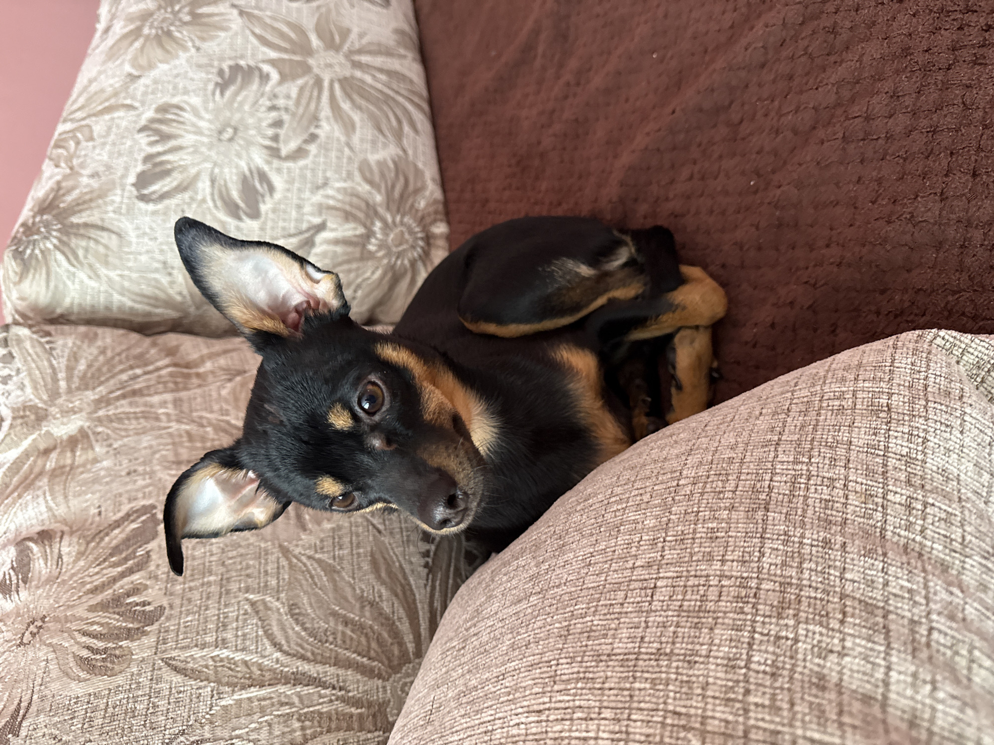 The scene depicts an interior setting in the city of Septemvri, Bulgaria. A small, black and tan domestic dog, consistent with a Miniature Pinscher or similar breed, is positioned on a sofa. The dog exhibits a predominantly black coat with distinct tan markings above its eyes, on its muzzle, chest, and legs. It has large, erect ears with visible pink interior tissue. The dog's dark brown eyes are directed slightly to the left of the frame, indicating an attentive gaze. Its body is curled, with legs tucked beneath it. In the immediate foreground to the left, a light brown cushion with a distinct woven, grid-like texture is partially visible. The dog rests on a dark reddish-brown, textured fabric surface, which appears to be the seat of the sofa. Behind the dog, another cushion, cream or beige in color and featuring an embossed or woven floral pattern, is present. A plain pinkish-beige wall or fabric surface is visible in the upper background. No human subjects or explicit interactions are depicted.