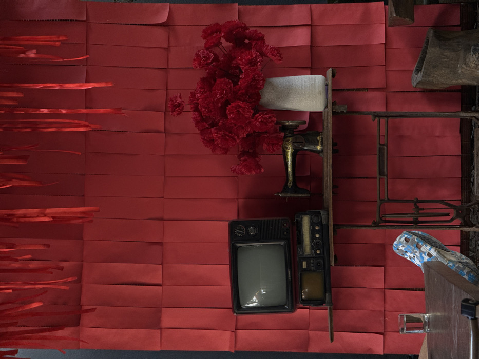 A red, textured backdrop displays various items. A bouquet of red flowers cascades near an antique sewing machine, an old television set, and a radio. To the right, a metal sewing machine stand sits near what appears to be a piece of wood and a blue and white patterned shoe. A gray object also appears above the sewing machine stand. The items are arranged in a cluttered, artistic manner against the bold, red background.