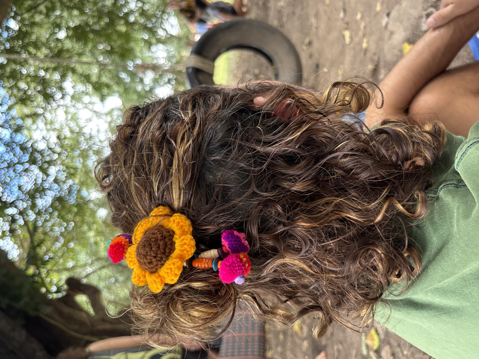 A person with curly, light brown hair is adorned with a crocheted sunflower and pom-pom hair clips. The individual wears a green shirt and sits outside on a sunny day. In the background, a tire swing hangs from a tree, and other people are faintly visible. The scene has a casual and playful ambiance.