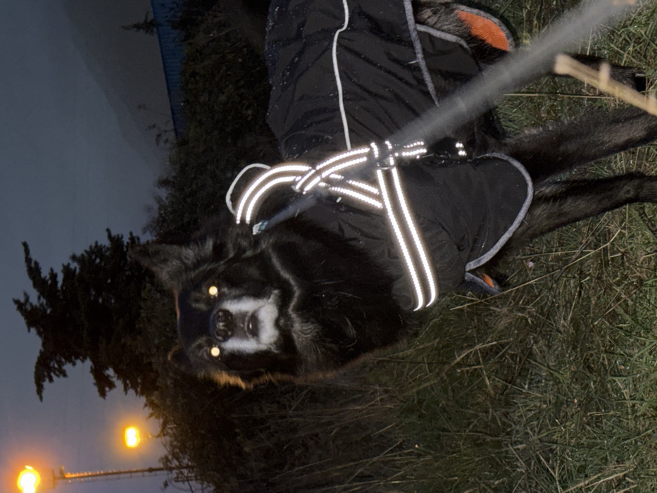- "A black dog stands on grassy terrain at dusk, clad in a black jacket with reflective strips" by FM-vBqzm1, licensed under CC BY 4.0