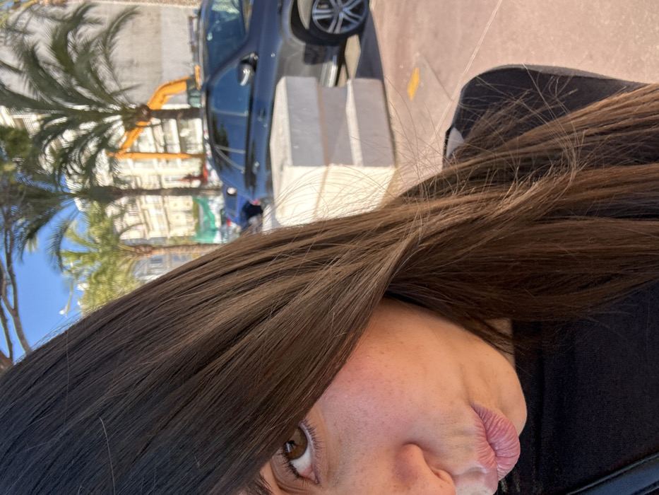 A close-up, angled photograph captures the left side of a person's face, displaying a brown eye, nose, and pursed lips. Long, dark brown hair cascades across the right side of the frame, obscuring part of the face. The person wears a dark, possibly black, garment. The background reveals an outdoor urban setting in Cannes, France, under a clear blue sky. Multiple tall palm trees line a street, behind which stand light-colored, multi-story buildings with traditional architecture. Vehicles, including a dark SUV, are parked on the street, and an orange arm of heavy machinery is visible amongst the distant buildings. A light-colored, multi-block concrete barrier is positioned on a reddish-brown paved surface in the mid-ground, which also features yellow markings.