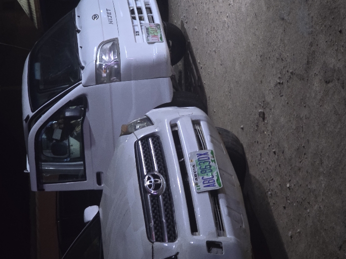 This image depicts two white vehicles parked on an unpaved dirt or gravel surface at night in an unknown city or area within Nigeria. In the foreground, the front end of a white Toyota RAV4 SUV is visible, featuring a prominent Toyota emblem on its grille. Its Nigerian license plate reads "11 ABUJA ABC-863DX". Behind the RAV4 and slightly to its right, a white Daihatsu Hijet van is parked. The driver's side door of the Hijet van is open. A blurred individual is discernable within the driver's cabin, wearing what appears to be a dark top and a cap or head covering. The Hijet van's Nigerian license plate reads "11 PLATEAU JJN-544YQ". The environment is illuminated by an artificial light source, casting visible shadows on the ground. The background is largely dark and indistinct.