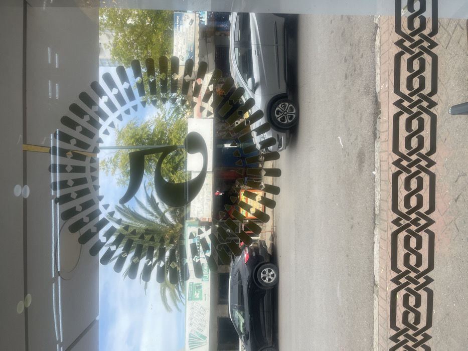 The image presents a street view in Meknes, Morocco, captured from an interior perspective looking out through a window. The window itself features a large, dark, stylized numeral "5" centrally located, surrounded by a radial pattern of dark, elongated segments. A dark geometric pattern resembling interlocking links runs along the bottom edge of the window. Beyond the window, an asphalt road occupies the midground. A black SUV, possibly a Ford Kuga or Escape, is parked on the left side of the street, facing left. A silver SUV, consistent with a Honda HR-V, is positioned on the right side of the street, facing right. Across the road, a brick-paved sidewalk fronts a row of commercial buildings. These buildings feature various storefronts, some with awnings and signage displaying Arabic script. One sign prominently features an image of green cards, suggesting a lottery or telecommunication service. Lush green vegetation, including a tall palm tree on the left and other deciduous trees, is visible behind the buildings and extends towards the upper frame. The sky above is partially cloudy blue. No individuals or direct interactions between people are discernible in the scene.