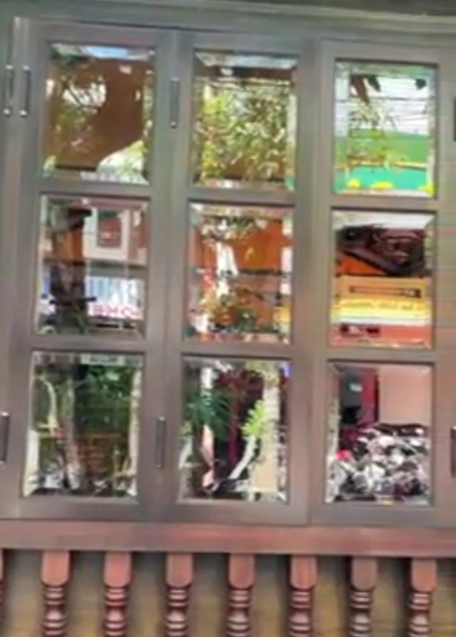 multi-pane window of a building. The frame of the window is dark brown wood and the window panes are reflecting the outside world. A wooden railing with spindles runs beneath the window. The reflections show buildings, trees, and parked motorcycles.