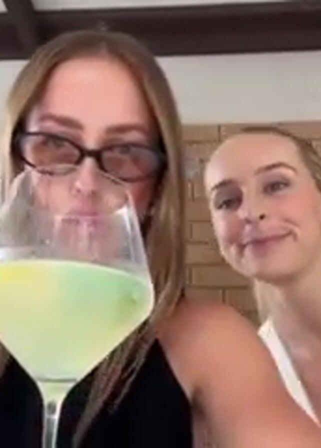 Two young women are standing close together, holding stemmed glasses with a pale green liquid