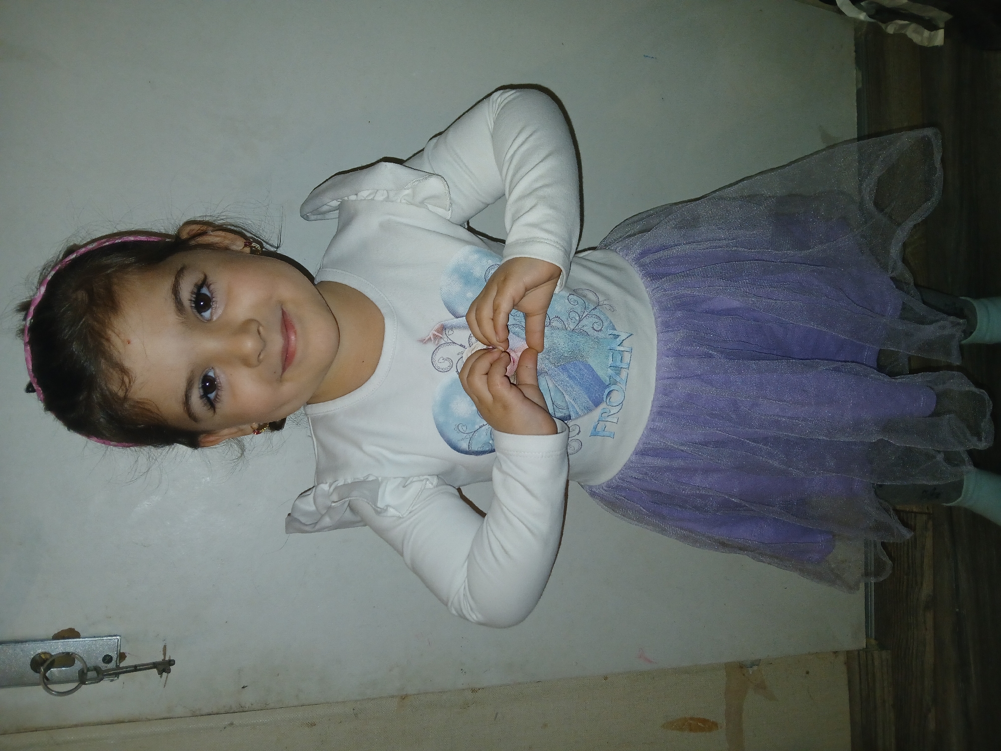 An indoor photograph displays a female child, estimated to be between three and six years old, standing centered and directly facing the camera