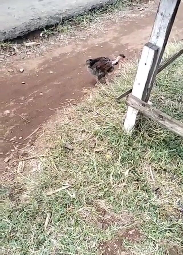 small, dark-feathered chicken with a red neck wading in a shallow puddle of muddy water. The chicken then walks out of the puddle and wanders off-screen to the left. The scene takes place outdoors next to a road, with some grassy areas, dirt, and a crude wooden structure with a black tire on top. The camera remains stationary throughout the clip.