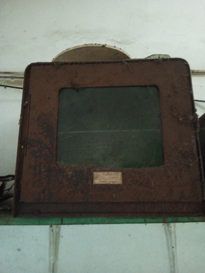 A rusted, aged, brown metal frame sits atop a green and white surface. Inside the frame is a dark green, dusty screen with a horizontal line. Above the frame, partially obscured, is a round, dirty object. A small, rectangular label is affixed to the bottom center of the frame. Cobwebs and debris cling to the frame and surrounding surfaces. The background consists of a white wall.