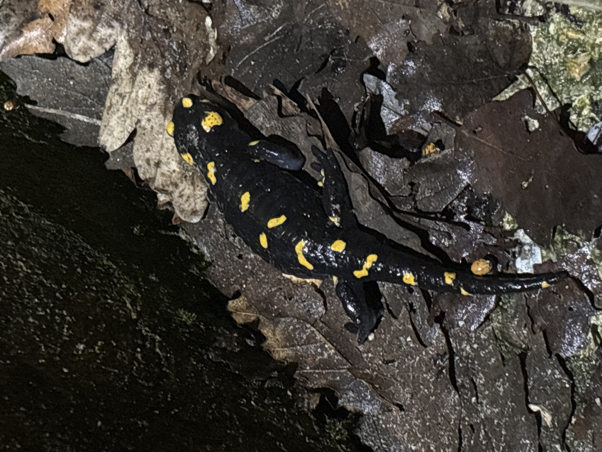 Fire Salamander (Salamandra salamandra) resting on damp, decaying leaves and soil. The salamander has a black body with distinct yellow spots. It is positioned diagonally across the frame, head towards the upper left and tail towards the lower right. The surrounding environment consists of dark, wet organic matter, including fallen leaves and possibly tree bark. The image was probably taken near Gabrovo, Bulgaria, though specific details beyond a forested area are lacking.