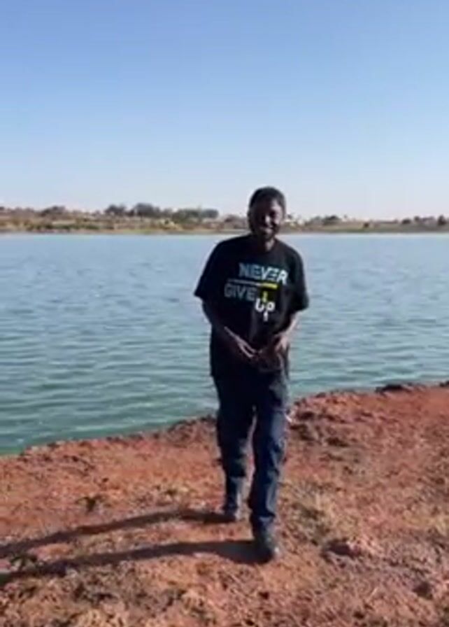 man standing near a body of water. He's wearing a dark T-shirt with the words "Never give up" on it, along with jeans and a black cap. He puts on the cap, then gestures towards the lake, saying "Beautiful Lamingo Dam." The landscape around the lake consists of brown earth and some low-lying hills in the background. The sky is clear and blue.
