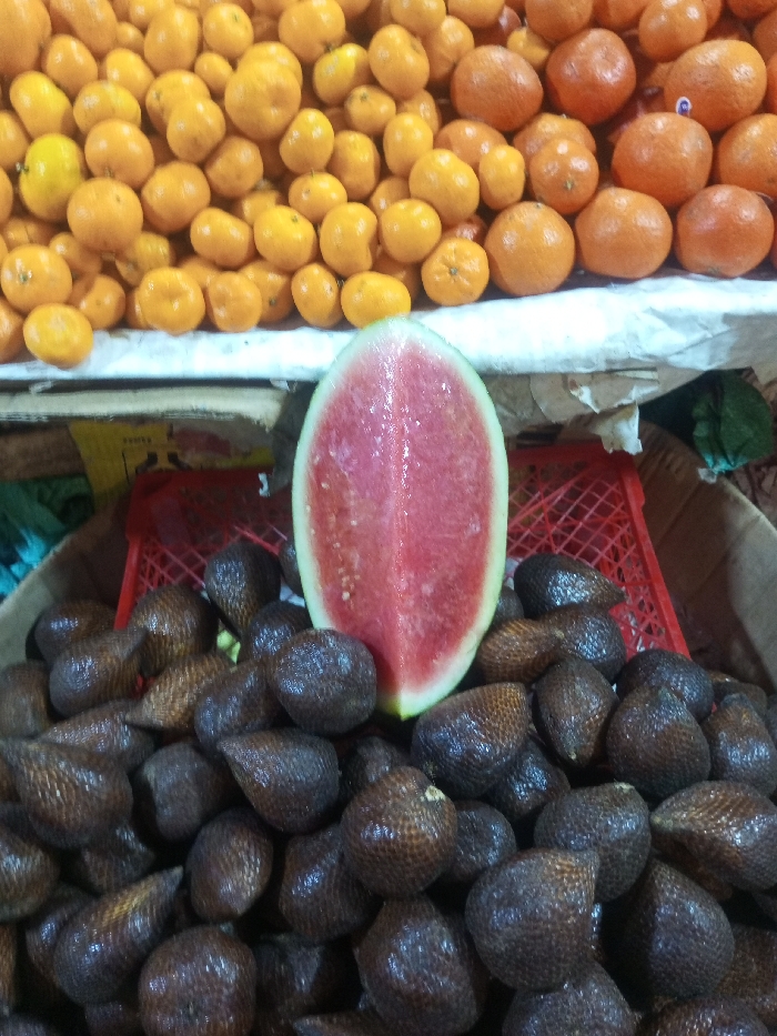 This image depicts a market stall in Cipanas, Indonesia, showcasing a variety of fresh produce. In the upper portion of the frame, a large quantity of small, round, orange citrus fruits, consistent with tangerines or mandarins, are piled on a white cloth-covered surface. Some larger, slightly darker oranges are also visible among them. Below this display, a red plastic crate holds a prominent, vertical slice of red watermelon, cut lengthwise, revealing its vibrant flesh and small black seeds. The lowest section of the image is dominated by a substantial pile of dark brown, scaly-skinned salak fruits, also known as snake fruit, which extend into what appears to be a cardboard box or similar container. No individuals or specific actions are visible within the scene.