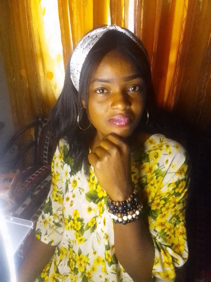 A female individual with dark skin, long dark hair, and a white polka-dotted headscarf is depicted in a close-up, seated pose. She wears a white top adorned with a yellow floral and green leaf pattern, silver-toned hoop earrings, and multiple beaded bracelets on her right wrist, which is positioned with a partially closed fist under her chin. Her gaze is directed towards the camera. To her lower left, a white smartphone with an illuminated ring light is visible, its glow reflecting on the phone's surface. The background consists primarily of yellow-orange curtains, vertically folded, with a dark, indistinct piece of furniture partially visible to the left. The scene is illuminated by artificial light, complemented by a warm glow from the background. Location: Unknown, Unknown.