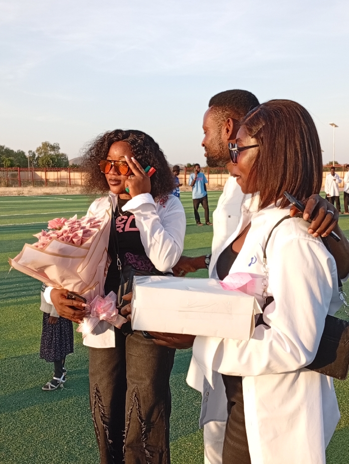 Three people stand on a green field. The person on the left, a woman, holds a bouquet of pink flowers and wears sunglasses, a white jacket, and black jeans. A man stands beside her, wearing a white shirt. A woman on the right, with short hair and sunglasses, also wears a white shirt and carries a small black purse. They stand on a green field with other people in the background. In the distance, there are buildings and trees under a clear sky.