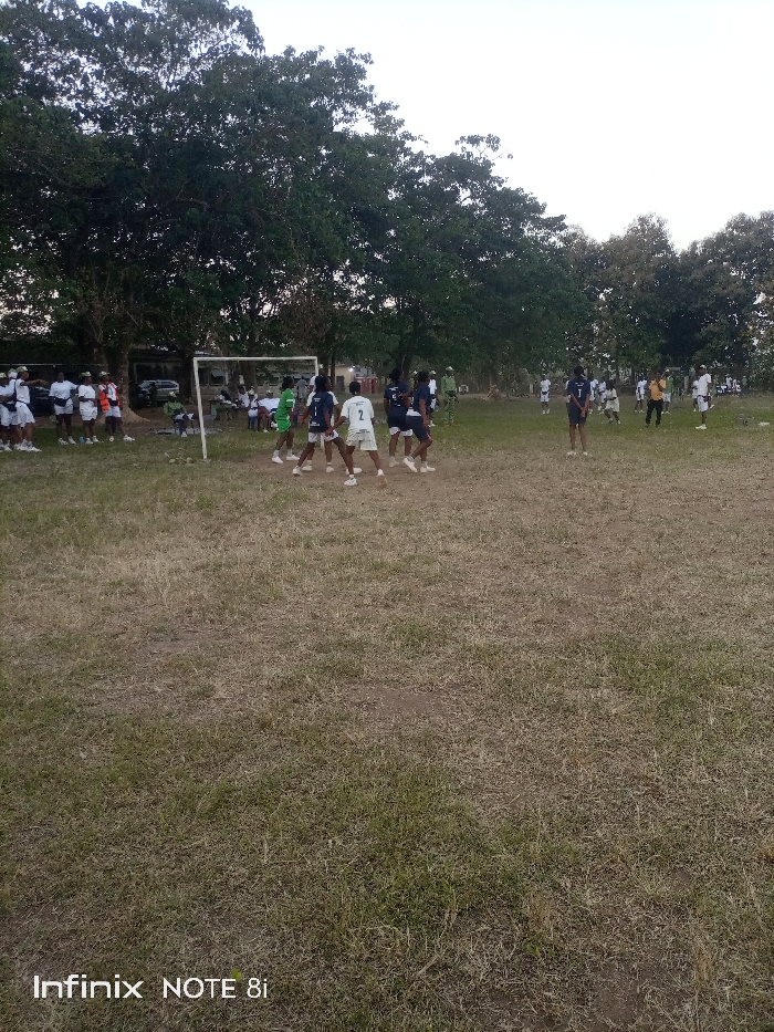 People are playing a sport on a grassy field with trees in the background. A soccer goal stands on the left, with several people dressed in white watching. A group of players are concentrated near the goal, engaged in the game. Other players are spread across the field. A car is parked in the background. The sky is overcast.