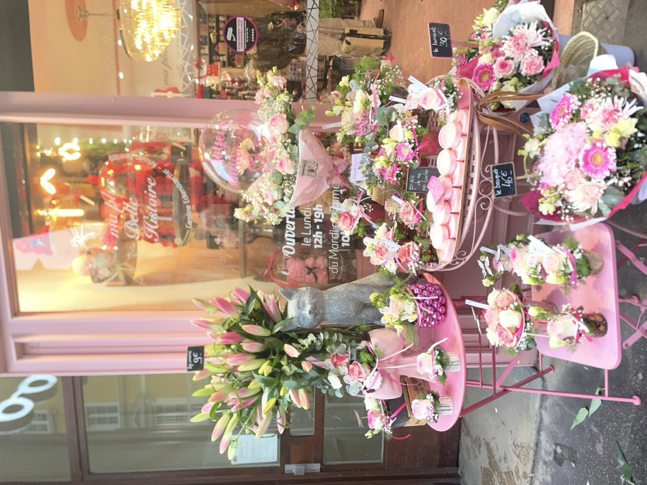 A quaint flower shop displays an array of bouquets and floral arrangements on pink tables outside its storefront. Lush lilies stand alongside arrangements featuring roses and gerberas. A sign advertises "le bouquet" at 46€. The shop window showcases the name "Ma Belle Histoire" alongside opening hours and the artisan's name. A gray cat statue sits amongst the flowers, adding a touch of whimsy to the scene.