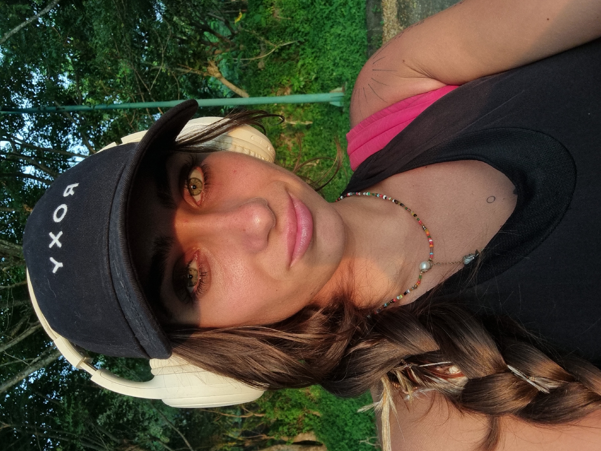 A close-up portrait of a female subject, approximately 20-35 years old, is captured outdoors in Pecatu, Indonesia. She has light-medium skin, prominent green eyes, and long brown hair styled in a braid over her left shoulder, possibly with light-colored strands or feathers intertwined. She is wearing a black baseball cap with "YXOR" embroidered in white, off-white over-ear headphones, a black sleeveless top, and a hot pink strap visible on her right shoulder. A multi-colored beaded necklace with a central pearl and a small metallic charm adorns her neck. A small black circular tattoo is present on her upper chest, and faint ray-like markings are visible on her right upper arm. Her face is illuminated from the right by warm, natural light, causing a slight glow on her forehead, nose, and right cheek. She looks directly at the camera with a slight smirk or smile. The background consists of dense green foliage and trees, with a faded green pole visible on the right.