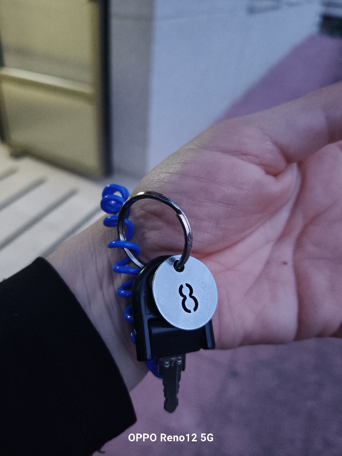 A close-up image depicts a person's hand and lower forearm, likely the left, holding a key assembly in an indistinct urban or indoor environment within Cuéllar, Spain. The hand, with visible skin tone and faint lines, extends from a dark-colored long-sleeved garment visible on the left side of the frame. A blue coiled plastic wristband, possibly serving as a keychain, is attached to a metallic split ring. This ring secures a circular, brushed metal tag featuring a stenciled cutout of the number "8." Also attached to the split ring is a black plastic component, which houses a small black metal key. The key's head is engraved with the number "879." The background is out of focus, revealing light-colored walls or surfaces and faint horizontal lines on a lower plane to the left, suggesting a hallway or entry area. The lighting appears dim or artificial. A digital watermark "OPPO Reno12 5G" is present in the lower left corner.