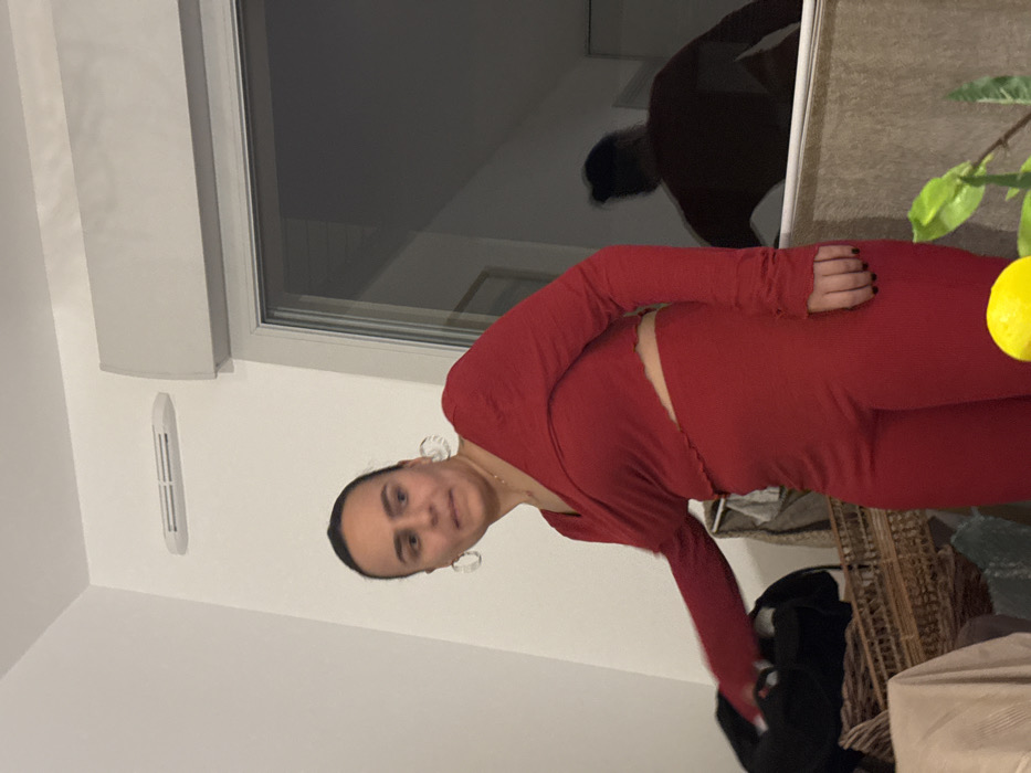 A woman in a red, long-sleeved outfit poses indoors. She has her hair pulled back, revealing clear, round earrings. Part of a window is visible in the background, reflecting a person in dark clothing. A beige woven basket or material is present beside her. A yellow lemon hangs from a plant, positioned near the woman. The room has white walls and a vent is on the wall in the background.