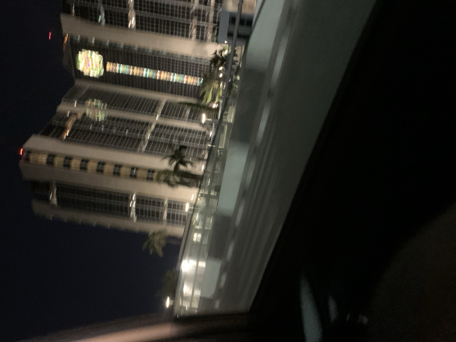 The image captures the NICON Luxury Hotel in the Central Business District of Abuja, Nigeria, at night. The multi-story hotel building features a predominantly light-colored facade with numerous dark-paned windows. A distinctive vertical column displaying multi-colored lights extends up the central portion of the building. In the midground, an elevated concrete structure, possibly a ramp or walkway, is visible, illuminated by several evenly spaced white lampposts. A metal railing runs along the visible edge of this elevated structure. Several dark palm trees are situated between the hotel and the elevated structure. The foreground is dark and blurred, consistent with the interior view from a vehicle, with a diagonal element on the left likely representing a window frame or car pillar. The sky overhead is dark, indicating nighttime conditions. No individuals or discernible actions are present within the frame.