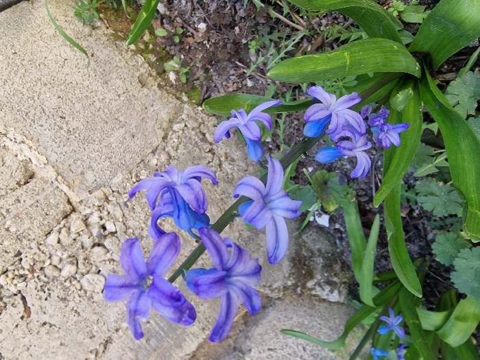 The image captures a close-up, slightly angled view of flowering plants situated in Dolna Gradeshnitsa, Bulgaria. The central subject consists of a cluster of purple-blue flowers, consistent with hyacinth, with individual blooms displaying five petals. These flowers are supported by green stalks and surrounded by broad, lanceolate green leaves at the base of the plant. In the upper left and central background, a rough-textured concrete or stone wall, light gray-beige in color, exhibits visible cracks, chipped surfaces, and embedded small aggregates. The lower right portion of the frame shows dark brown soil, sparsely covered with small green foliage and some dry organic matter. No human subjects, animals, or active interactions are present in the scene.