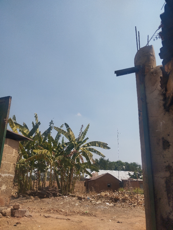 The image depicts an outdoor scene in Idon, Nigeria, under a clear, pale blue sky with minimal cloud cover. The foreground consists of unpaved, reddish-brown dirt ground with scattered debris. To the left, a partial concrete block structure is visible. To the right, a weathered concrete pillar with exposed rebar at its apex and a dark metal beam projecting horizontally frames the scene. In the midground, a dense cluster of banana trees with large green leaves stands prominently. To the right of the banana trees, several single-story structures constructed from reddish-brown material (likely mud brick) with corrugated metal roofs are present. The ground around these buildings is also dirt, interspersed with dry vegetation and refuse. A pile of dark, elongated objects, possibly cut wood or plant stalks, lies at the base of the banana trees. In the background, additional green foliage and a tall, slender antenna or mast are visible against the sky. No individuals or active interactions are observed.