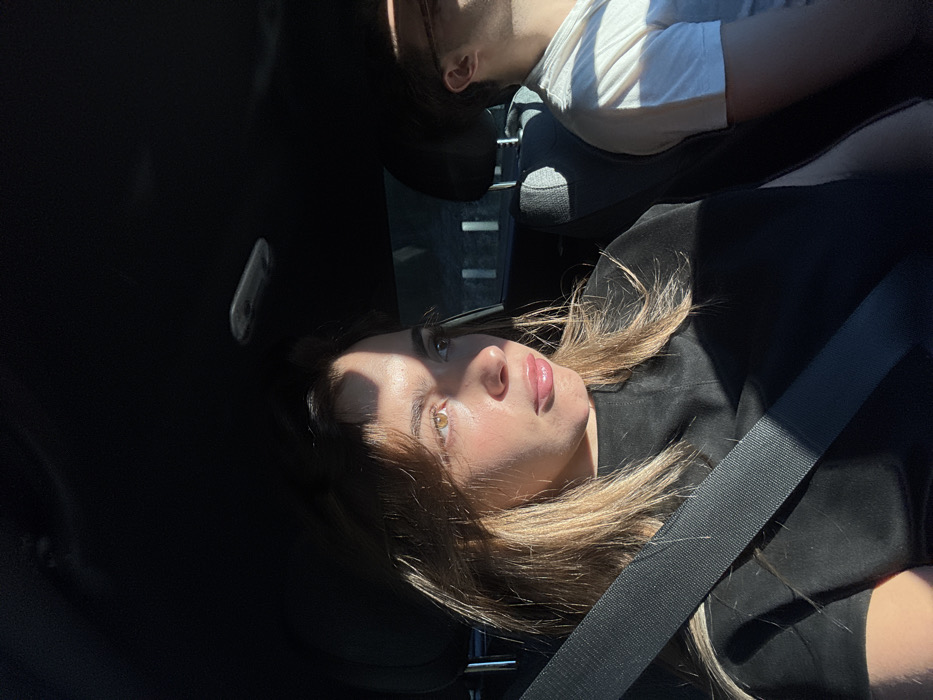 The image depicts the interior of a moving vehicle, illuminated by strong, low-angle sunlight entering from the right. A female individual is seated in the front passenger seat, positioned on the left side of the frame. She has light brown hair and wears a black top, with a black seatbelt secured across her chest. Sunlight brightly illuminates the right side of her face, highlighting her right eye, which appears amber, her nose, and her slightly parted, glossy lips. Her gaze is directed towards the right, outside the frame. To her right, partially visible in the driver's or rear passenger seat, is a male individual wearing a white short-sleeved top. Only his right shoulder, arm, and part of his head are discernible, with sunlight catching his features; he appears to be wearing glasses. The car's headliner is dark. The exterior environment visible through the windows is blurred and indistinct, showing dark and light vertical elements, insufficient for identifying a specific street or landmark within Figueira da Foz, Portugal.