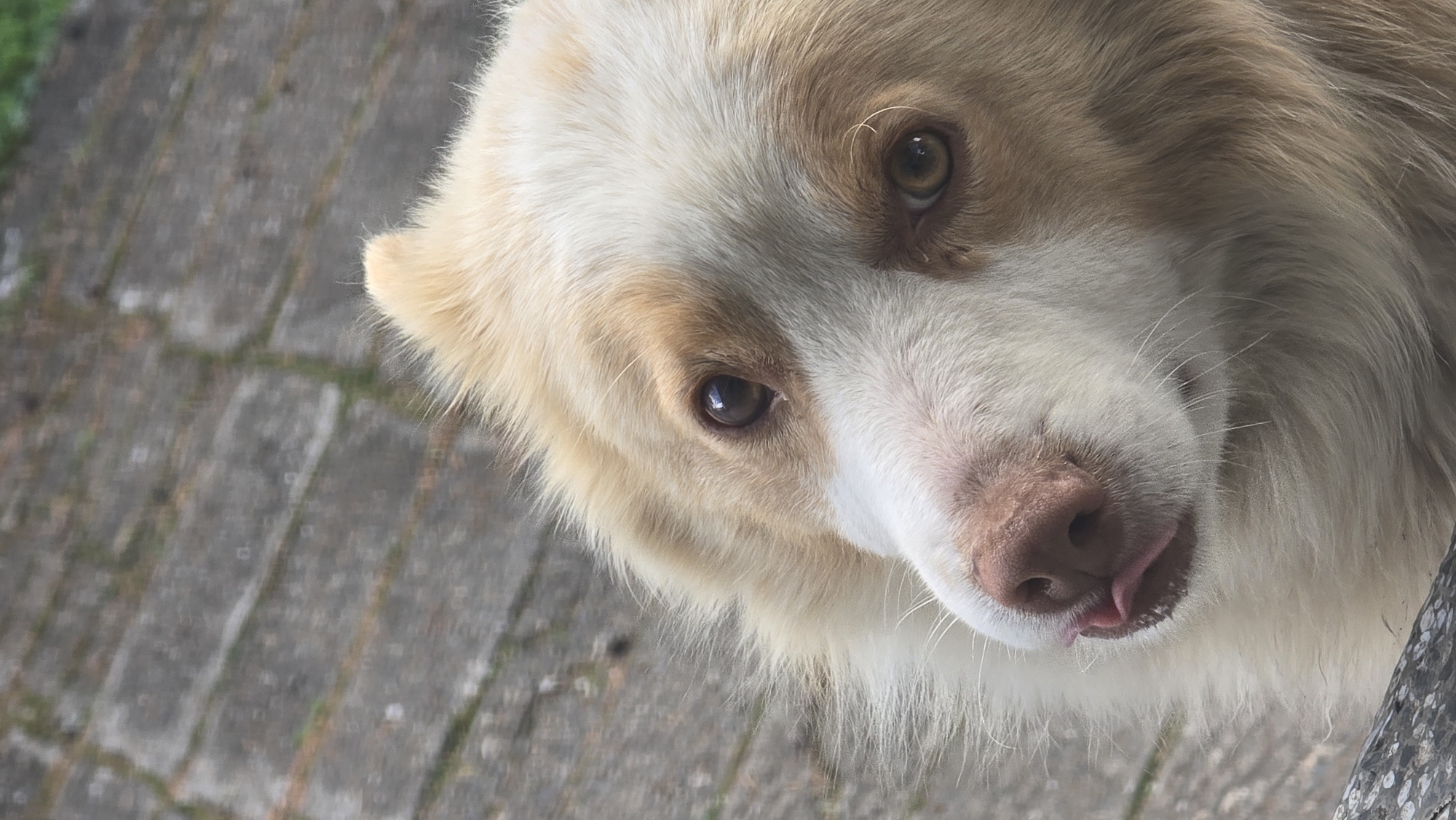 A light-colored dog, likely an Australian Shepherd or similar breed, is depicted in a close-up, head-and-shoulders portrait. The dog features a white and light brown/tan fur pattern, with prominent white fur on the forehead and muzzle, and light brown markings around its large, amber-brown eyes. Its pinkish-brown nose is visible, and a small pink tongue is slightly extended from its mouth. The dog's head is tilted slightly to its left, and it is looking directly at the viewer. The background consists of a blurred paved surface, appearing to be grey rectangular pavers or bricks with some green growth in the interstices, suggesting an outdoor location such as a patio or walkway. A dark, out-of-focus object is partially visible in the bottom left foreground. The scene is located in Izvorche, Bulgaria.