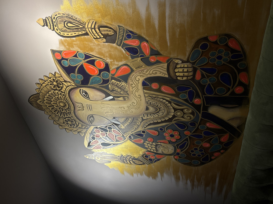 A large, intricately stylized mural depicting the Hindu deity Ganesha adorns a light-colored wall in a venue located in Varna, Bulgaria