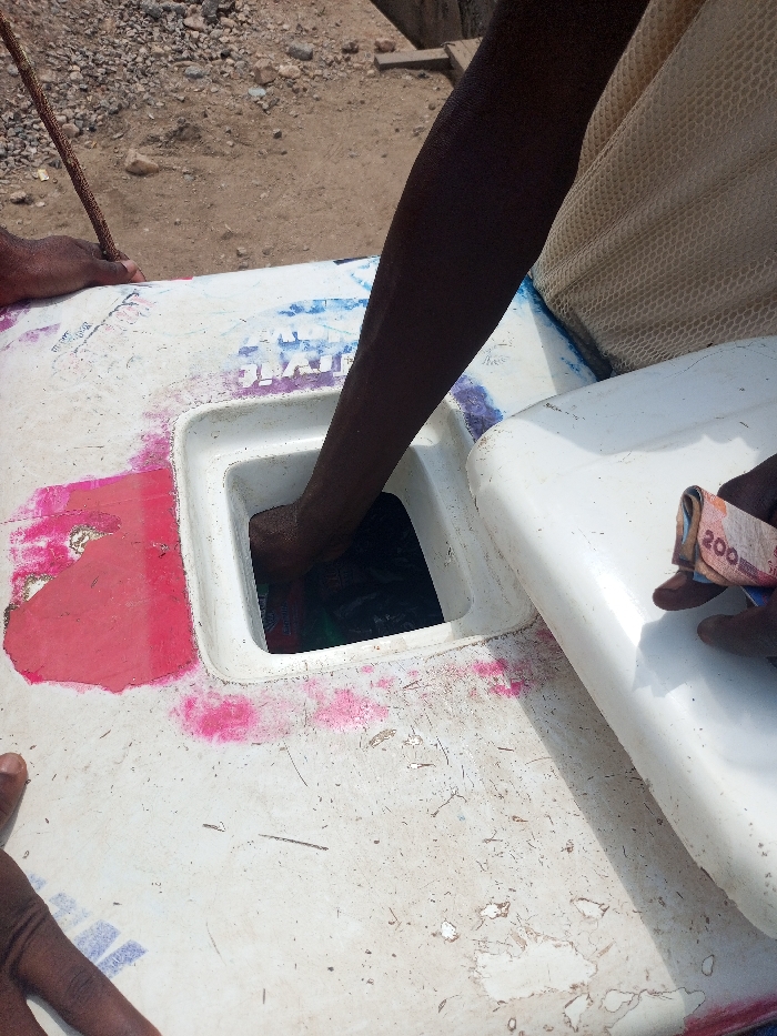 In Zango-ndaji, Nigeria, an overhead view depicts an outdoor transaction. A dark-skinned individual's arm extends into a recessed opening of a worn, white plastic cooler, which exhibits faded red and blue/purple paint and multiple scuff marks. The cooler's interior contains obscured items with visible hints of green and red packaging. To the left, a second dark-skinned hand rests on the cooler, holding a thin, reddish-brown stick or rope. On the right, a third dark-skinned hand holds a folded 200 Nigerian Naira banknote near an adjacent white surface, possibly another cooler lid. The scene is set on a dusty, light brown ground interspersed with gravel.
