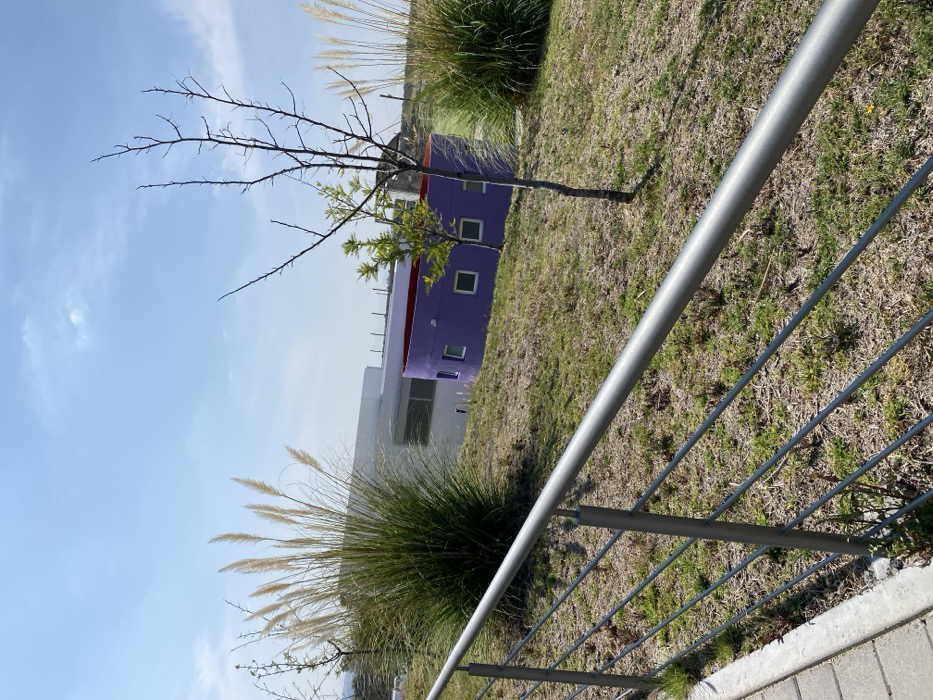 A landscape scene shows a grassy slope, a silver metal railing, and a purple building with white-framed windows. A small tree with bare branches stands between the building and the railing. To the left, tall ornamental grasses with white plumes sway near the railing. The sky, a pale blue, is visible behind the grasses and the building. The composition is framed at an angle, with the railing prominently featured.