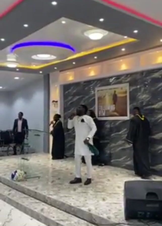 A man in a white tunic and matching pants is singing on a stage in a church, with a microphone in his hand