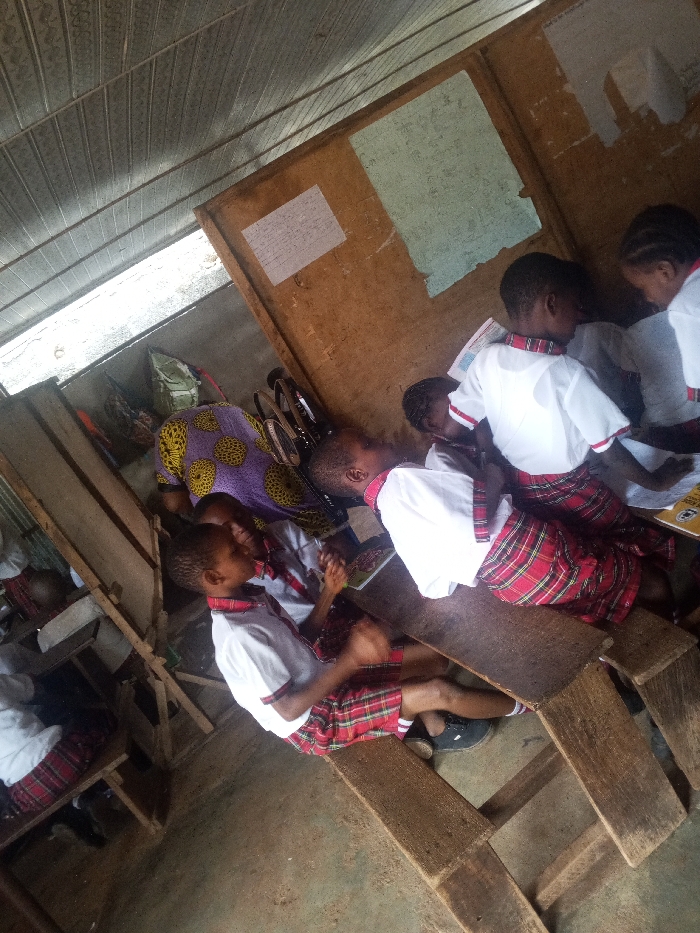 An indoor, tilted photograph captures a classroom scene. The room features unpainted wooden plank walls, a light grey corrugated metal ceiling, and an unsealed concrete floor. Natural light illuminates the space from an unseen source to the left. Six individuals are present: one adult female and five children. The children, appearing to be 6-10 years old, are uniformly dressed in white short-sleeved shirts with red and white striped collars and red, black, and white plaid shorts or skirts. They are seated on worn, unpainted wooden benches positioned at matching wooden desks. On the right, three children are visible around a desk. One child in the foreground is seated, facing right, with clasped hands. Behind this child, another is seated, facing away from the camera, looking at a book or paper on the desk. A third child is partially visible to the far right, also engaged with material on the desk. On the left side of the frame, another child in uniform is seated at a separate wooden desk. Behind this child, an adult female, dressed in a purple garment with yellow circular patterns, leans forward, looking down towards the children or a surface. A green backpack rests on the floor near her. Papers, one white and one light green, are affixed to the wooden wall. Books or notebooks are present on the desks. The scene depicts a learning activity within a basic school environment.