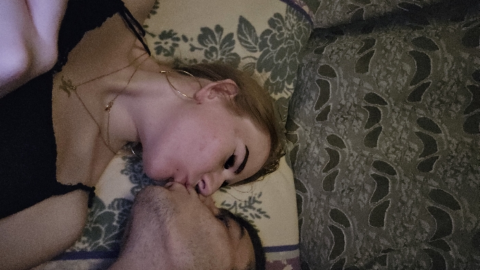 The image displays two individuals engaged in a kiss in an indoor setting. A light-skinned female, with blonde hair, prominent dark eyebrows, and dark eye makeup, is visible on the left. She wears gold-colored hoop earrings, at least two gold-colored necklaces (one with an initial "M" pendant), and a black strap top. Her lips are pursed and in contact with the lips of a second individual, partially visible on the right. This second individual appears male, with visible facial stubble. Both individuals appear to be lying down. The background consists of patterned bedding or pillows; a section behind the female's head shows a light-colored fabric with a green floral design, while another section above features a darker fabric with a repeating abstract, possibly leaf-like or amoeba-like, pattern in lighter tones. The lighting is subdued. No specific landmarks or unique features are present to determine a precise location within the city of Burgas, Bulgaria; the scene is consistent with a private residential interior.