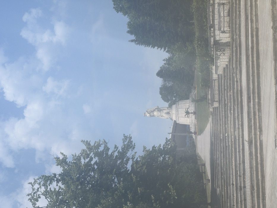 A hazy image reveals a towering statue atop a stepped monument, bordered by trees and a broad staircase. The sky, a blend of blue and clouds, provides a backdrop. The scene suggests a public space or park.