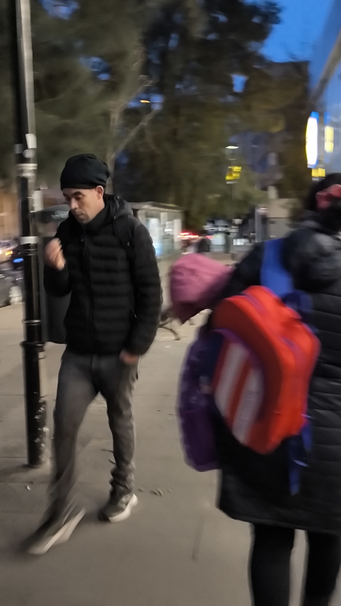 A person wearing a black puffer jacket, beanie, and grey jeans walks on a sidewalk. Another person, partially visible, wears a black coat and carries a red, white, and purple backpack. A streetlamp is on the left. Trees and blurry lights are in the background, suggesting a nighttime scene. The image is slightly blurred due to motion.