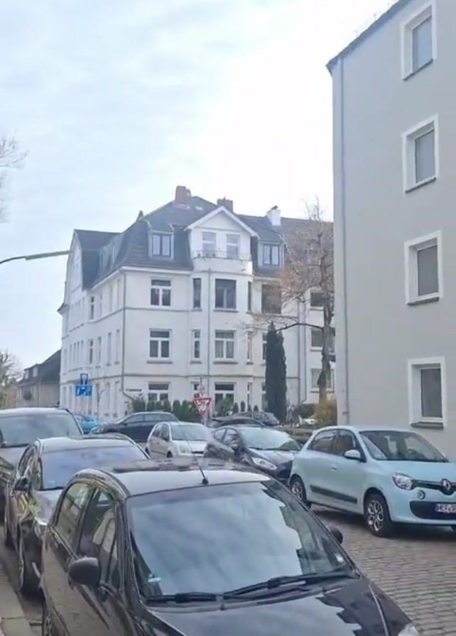 street scene in Germany with cars parked along the side of the road. The camera pans up to show buildings on both sides of the street, including a white building with a grey roof. The sky is cloudy. A person walks along the sidewalk in the distance.