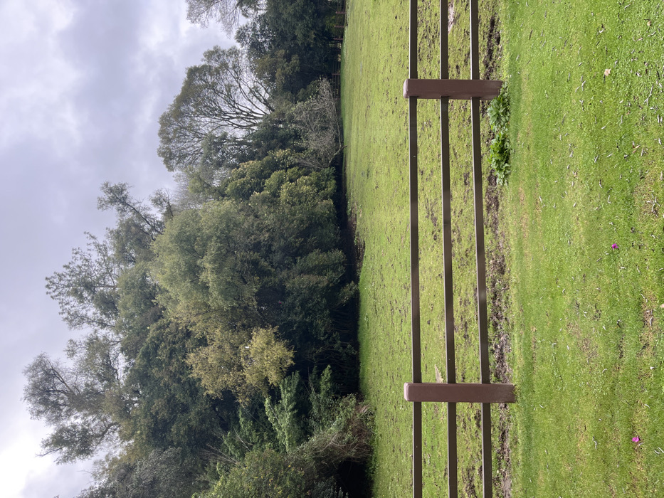 This image presents a rural landscape in Huasca de Ocampo, Mexico, under an overcast sky. The foreground consists of neatly maintained green grass containing minimal scattered purple specks. A dark brown wooden fence, composed of two visible vertical posts and three horizontal rails, bisects the lower mid-ground. Beyond the fence, a large, open green pasture with uneven texture and visible patches of exposed earth extends towards the background. The background is dominated by a dense, multi-layered line of diverse trees, including both deciduous and coniferous types, some exhibiting bare branches. The sky above is uniformly grey and heavily clouded. No individuals, animals, or specific actions are depicted.