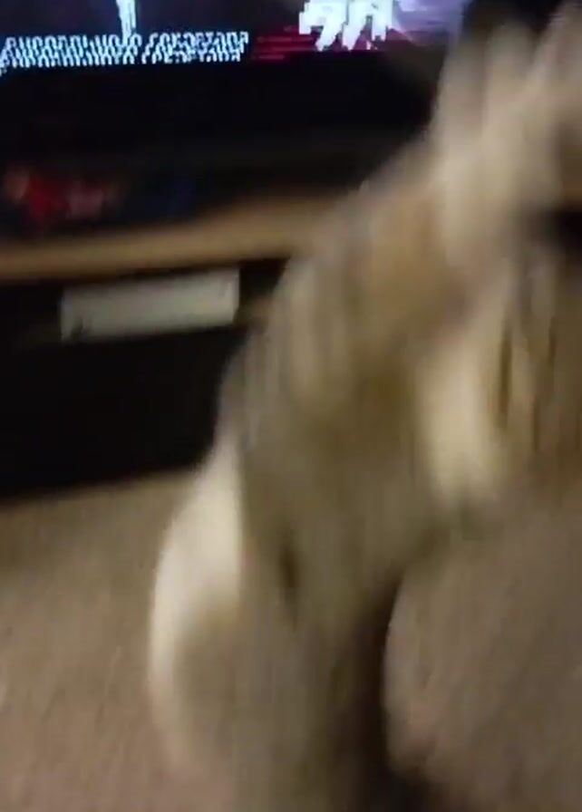 A light-colored tabby cat is standing on a patterned floor. The cat jumps up on its hind legs toward the camera. The cat then jumps onto a black side table. A person says “Oops!” after the cat jumps.