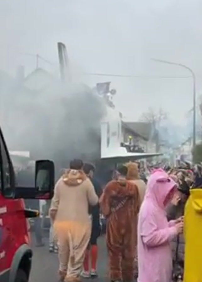 The scene unfolds on a street where a parade is taking place, amidst a cloudy and overcast atmosphere. A red firetruck labeled "FEUERWEHR 112" (Fire Department 112) is visible on the left side of the frame, partially obstructing the view. The focus is drawn to a large, white structure resembling an airplane or float, emitting thick white smoke, suggesting it's part of the parade. Numerous people are lining the street, many dressed in costumes. Notable costumes include individuals in lion, bear, and pink bunny pajamas, adding a whimsical element to the event. Some people are interacting with each other, and the general atmosphere appears festive. The environment suggests a small town setting, with buildings visible in the background, although obscured by the smoke and overcast sky.