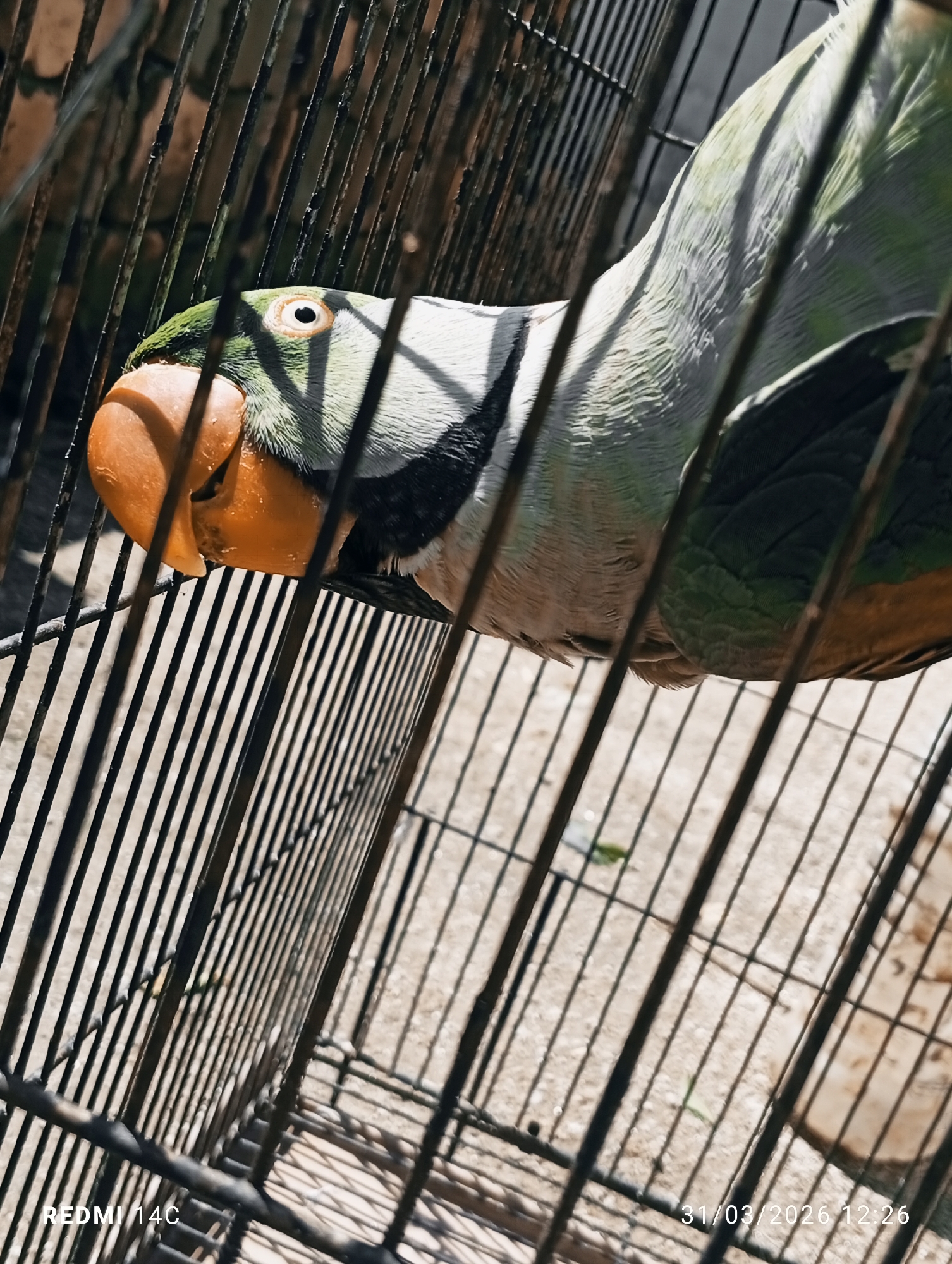 A medium shot depicts an Alexandrine Parakeet within a wire cage in Lassan, Pakistan. The parakeet, predominantly green and white with a distinctive orange beak and black neck ring, faces left and slightly upwards. The cage bars create a grid pattern, with the concrete floor visible at the bottom. The date "31/03/2026 12:26" is digitally overlaid in the bottom right corner, and "REDMI 14C" is in the bottom left.