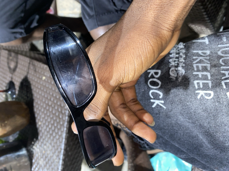 A dark-skinned hand holds a pair of black sunglasses, displaying a crack in the lens. The glasses reflect light, suggesting a glossy surface. The person is wearing gray pants with white text that reads "Social...prefer Rock". The background is a woven patio furniture, and there are other items in the background, partly obscured. The overall image has a casual, candid feel.