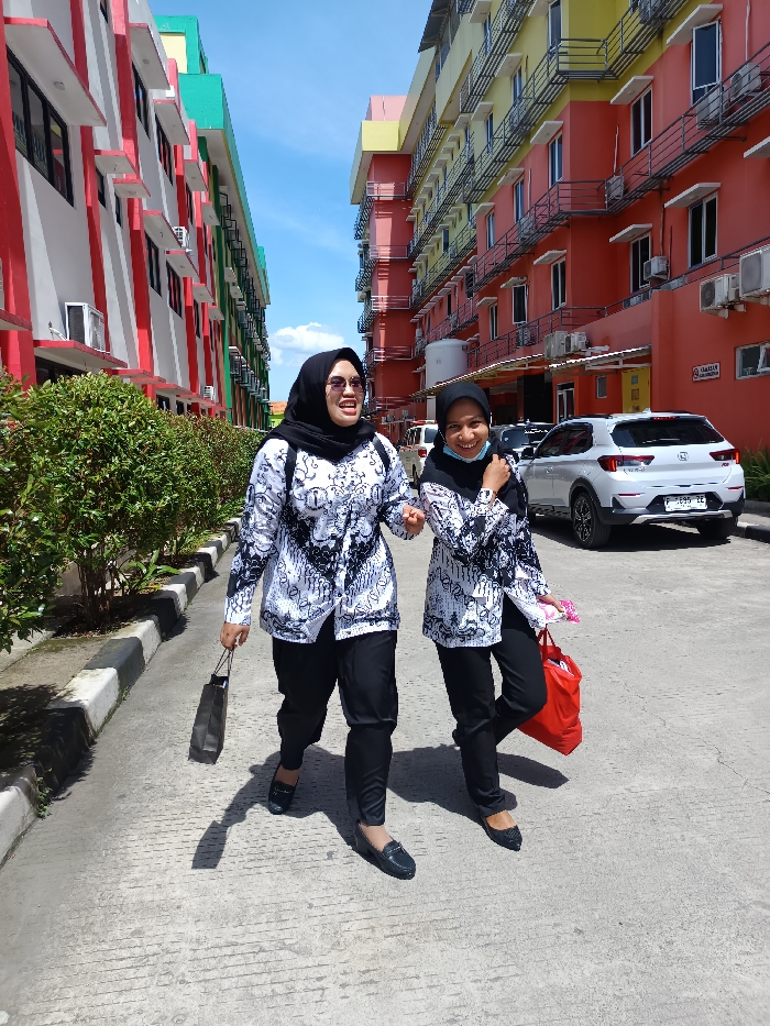 Two women walk side-by-side on a sunny day. Both wear patterned black and white blouses, black pants, and black shoes. The woman on the left carries a black bag, while the woman on the right carries a red tote bag. They stroll along a paved road lined with colorful buildings in red, green, white, and yellow. A white SUV is parked nearby. The sky is blue with sparse clouds. One of the women wears sunglasses and a hijab. The other woman wears a face mask.