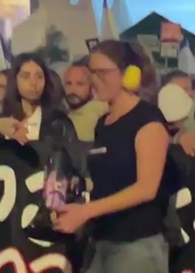 group of people protesting at night. They are standing behind a black banner with writing on it. Some people are holding flags and signs. There is a woman in the foreground with yellow ear protection who appears to be leading a chant with a megaphone. The background features a building with a large screen displaying text in Hebrew. The atmosphere suggests a political rally or demonstration.
