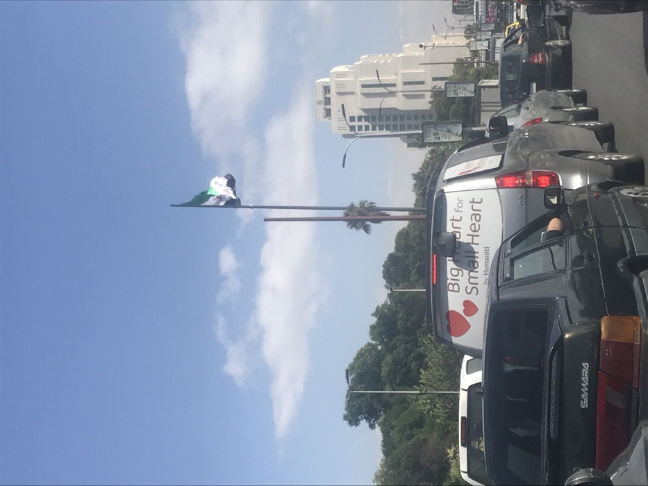 The image displays a daytime urban street scene in Al-Muhajerin Municipality, Syria. The sky is clear blue with scattered white cumulus clouds. In the mid-ground, a tall flagpole prominently displays a green, white, and black flag with three red stars in the central white stripe, unfurled by a breeze. Adjacent to the flagpole is a palm tree and dense green foliage lining what appears to be a park or embankment on the left. To the right, a distinctive, multi-tiered white building with multiple windows and a modern architectural style rises in the background. The foreground is dominated by vehicular traffic on a multi-lane road. The closest vehicle is the rear of a dark-colored sedan, likely a Lada Samara, with a person's right arm resting on the open driver's side window frame. Immediately ahead of this sedan is a silver-grey minivan, whose rear window features a large sticker depicting two red hearts and the text "Big Heart for Small Heart by Humaniti." Further ahead, a line of additional vehicles, including a black sedan, are visible, indicating stationary or slow-moving traffic. Multiple streetlights with curved arms are positioned along the roadside.