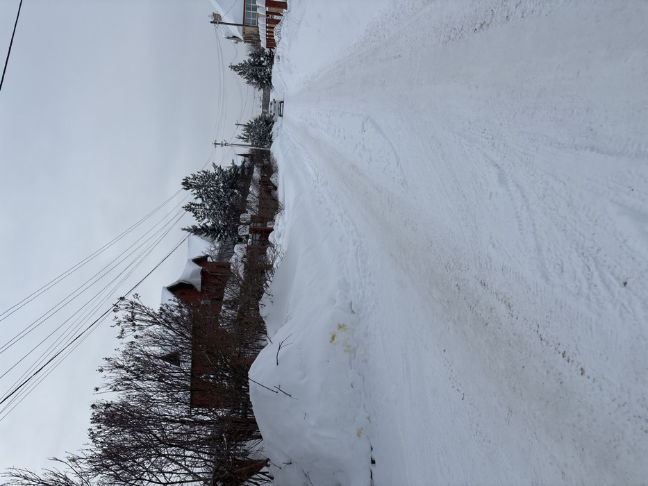 A snow-covered road, marked by tire tracks, stretches into the distance. High snowbanks line the right side. On the left, trees and rooftops covered in snow are visible against a gray sky. Power lines run parallel to the road. The scene depicts a snowy, possibly rural, environment. The heavy snowfall obscures details of the landscape.